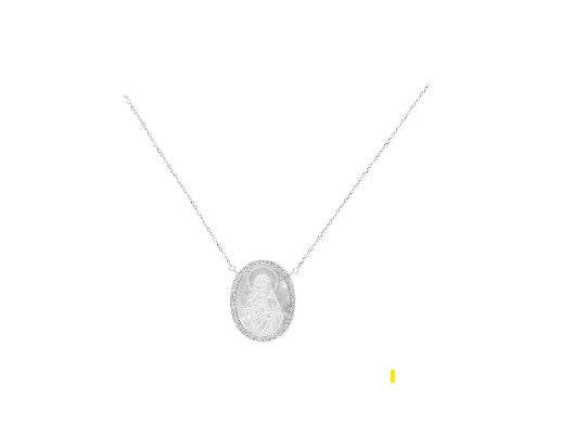 Deléitese con la elegancia divina de este collar de plata de ley 925, adornado con una medalla del Sagrado Corazón de Jesús y delicados cristales. Este collar, que encarna la gracia y el estilo, es una incorporación deslumbrante a cualquier colección de joyas y un recordatorio atemporal de la fe y la devoción. Borde con cristales y centro perlado.